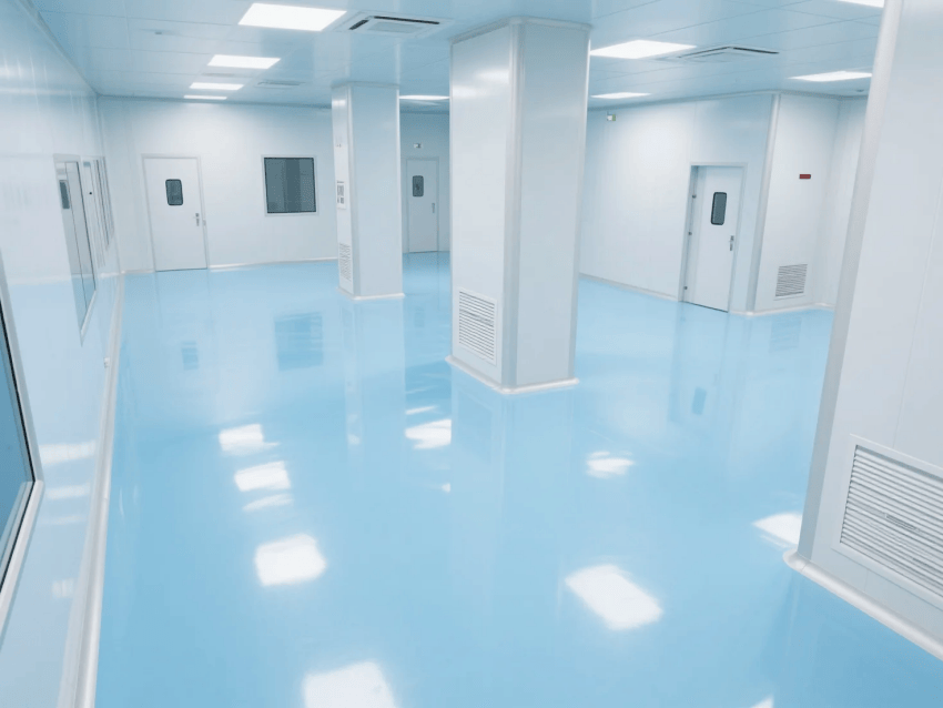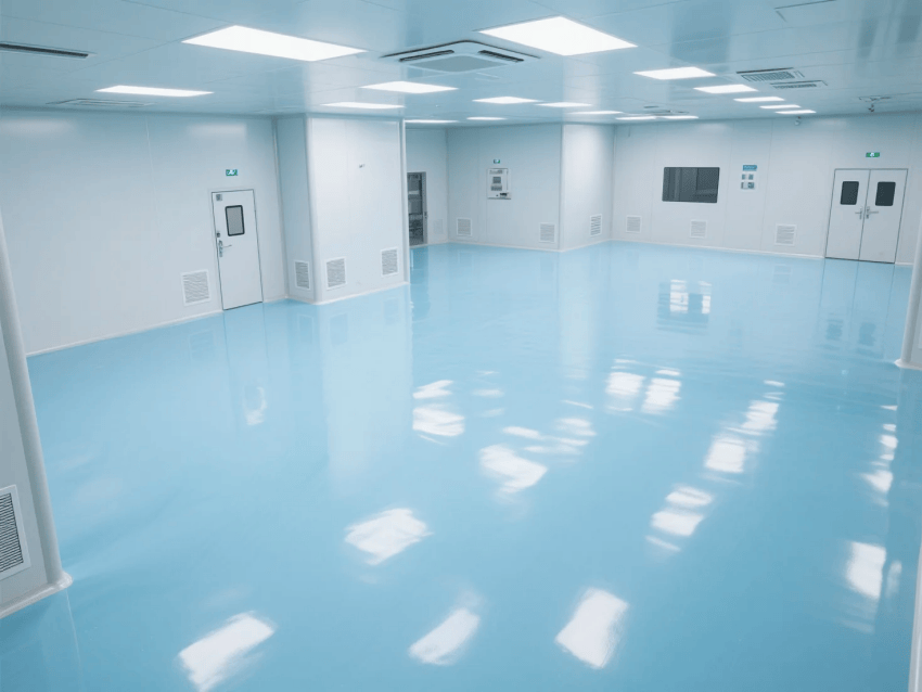 地面系統采用3mm厚環氧防靜電自流平地坪,表面電阻穩定在10^6-10^9Ω范圍,耐磨系數達0.6以上,滿足電子元器件生產的防靜電要求。吊頂系統配置FFU+HEPA過濾單元組合,換氣次數≥25次/小時,維持穩定的單向流氣流組織。功能區域通過淺藍色環氧樹脂劃線區分,設備基座采用啞光白不銹鋼包邊,既確保密封性又強化視覺引導。