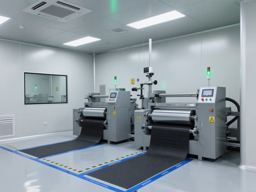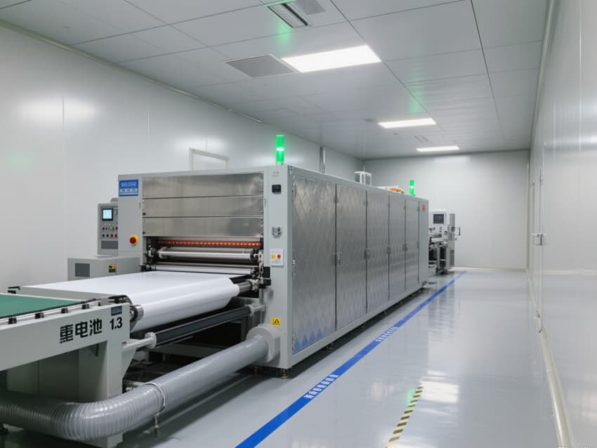車間以銀灰色抗菌金屬彩鋼板搭建墻體與吊頂,搭配淺灰色防靜電環(huán)氧地坪,金屬質(zhì)感的建材兼具抗電解液腐蝕、易清潔特性,地面藍(lán)色防靜電標(biāo)識(shí)線清晰劃分涂布、卷繞、裝配等工序區(qū)域。頂部高效過濾器與定向?qū)恿飨到y(tǒng),實(shí)現(xiàn)每小時(shí)18-22次空氣置換,配合除濕機(jī)組將濕度精準(zhǔn)控制在20-30%RH,避免水分影響電芯性能。?