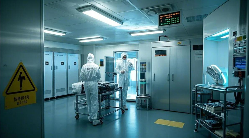 半導體晶圓廠潔凈車間,工業級無塵環境設計。更衣區設置環氧樹脂自流平地坪,墻面嵌入正壓送風百葉,紫外線消毒衣柜線性排列。風淋通道配備360度旋轉氣流噴嘴,頂部