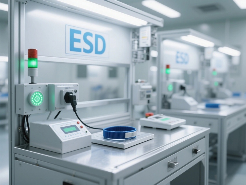 核心區(qū)域可見(jiàn)百級(jí)潔凈度的光刻車(chē)間,頂部密布FFU風(fēng)機(jī)過(guò)濾單元,通過(guò)垂直層流控制微粒濃度(≤0.3μm顆粒每立方米<100個(gè))。操作臺(tái)采用防靜電材質(zhì),配備離子風(fēng)扇消除靜電干擾。?