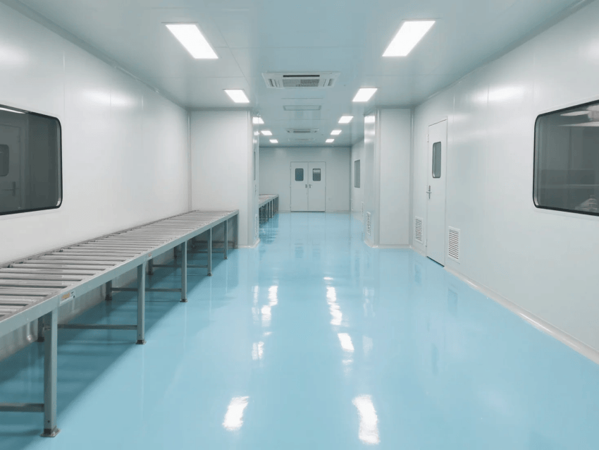 地面系統(tǒng)采用3mm厚環(huán)氧防靜電自流平工藝,表面電阻值穩(wěn)定控制在10^6-10^9Ω,摩擦系數(shù)0.6-0.8,滿足精密電子制造對(duì)地面的特殊要求。吊頂系統(tǒng)采用FFU+HEPA高效過濾組合,換氣次數(shù)≥25次/h,維持穩(wěn)定的層流狀態(tài)。功能分區(qū)通過淺藍(lán)色環(huán)氧劃線清晰標(biāo)識(shí),設(shè)備區(qū)采用啞光白不銹鋼包邊處理。