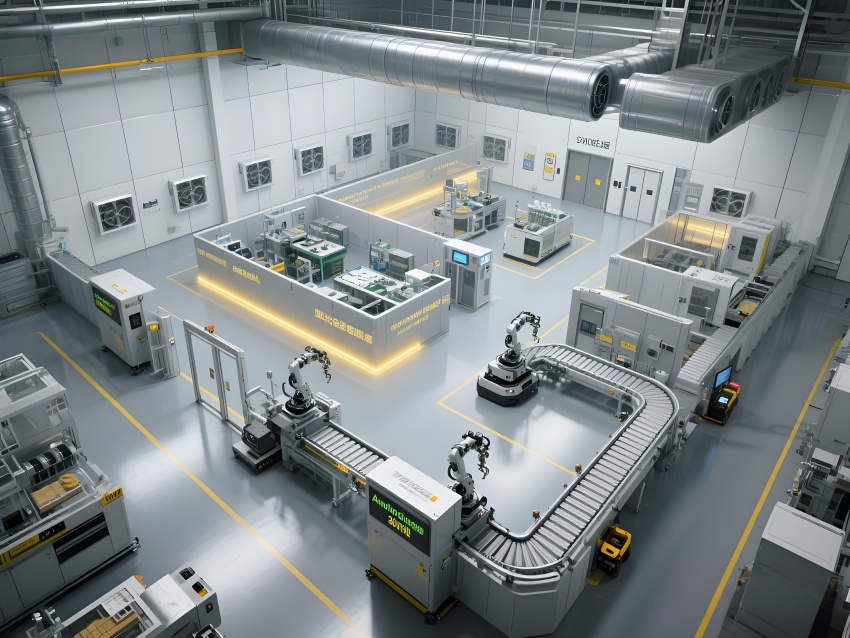 本車間以"精密工業(yè)美學(xué)"為設(shè)計(jì)主題,構(gòu)建銀灰色主調(diào)的科技制造空間。頂棚矩陣排列的FFU單元形成蜂巢狀光影,與地面熒光綠流線導(dǎo)向標(biāo)識構(gòu)成三維潔凈動線。防靜電環(huán)氧地面嵌入銅絲導(dǎo)電網(wǎng),墻面采用陽極氧化鋁板與可視壓差監(jiān)測窗。核心SMT區(qū)配備全自動懸吊式貼片機(jī)群,紅色激光校準(zhǔn)射線在設(shè)備間交織。黃光作業(yè)區(qū)采用琥珀色漫射照明,與普通區(qū)的冷白光形成鮮明功能區(qū)分。透明亞克力防塵簾分隔各工序段,AGV機(jī)器人沿藍(lán)色磁軌無聲穿梭。數(shù)據(jù)看板懸浮顯示實(shí)時良率與溫濕度參數(shù),頂部螺旋風(fēng)管配合地面回風(fēng)口形成垂直層流。整體通過金屬冷質(zhì)感與智能交互元素的碰撞,打造兼具工業(yè)嚴(yán)謹(jǐn)性與未來科技感的精密制造環(huán)境。