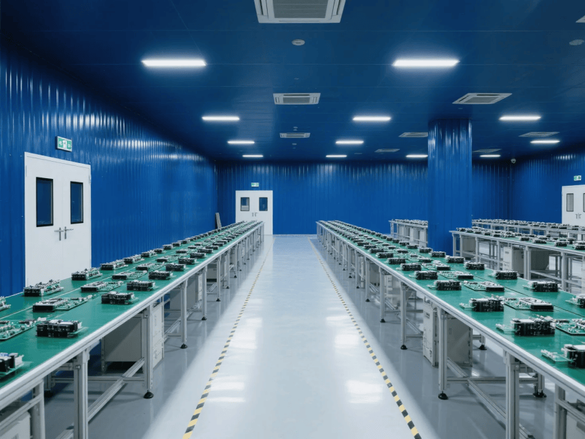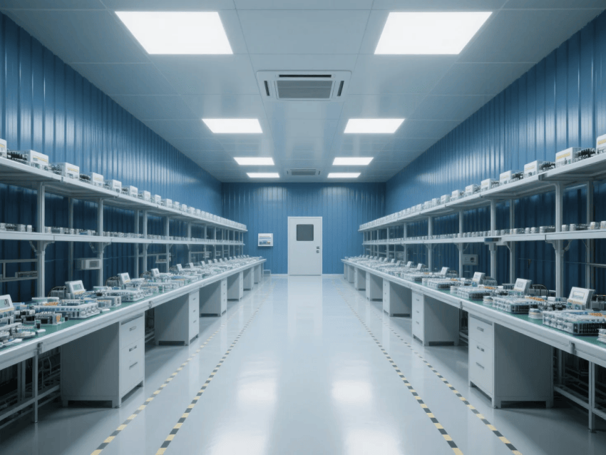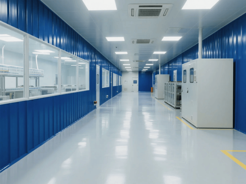本工程嚴格遵循ISO14644-1Class8標準,采用"工業科技風"設計理念,打造現代化電子零件制造環境。車間以深藍彩鋼板墻體與淺灰防靜電環氧地坪形成鮮明視覺對比,營造兼具科技感與功能性的生產空間。