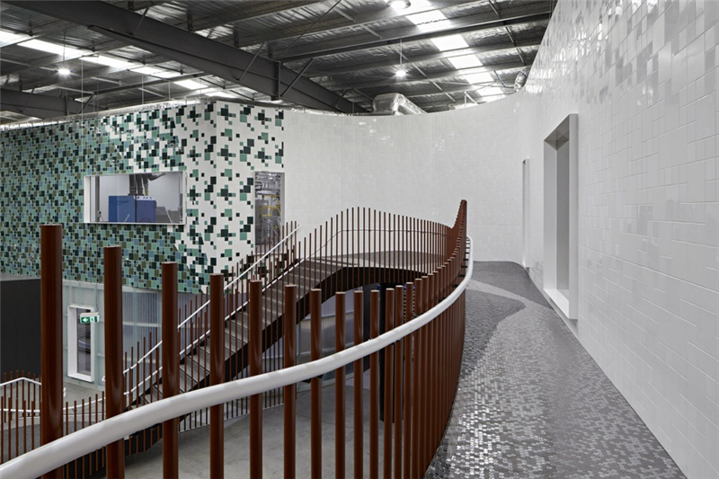 多彩的線條從附近的自然保護(hù)區(qū)一直延伸到位于生產(chǎn)區(qū)核心地帶的巨型壁畫上,吸引著員工和參觀工廠的訪客。產(chǎn)自本地的澳洲硬木和紋理豐富的墻面從外部景觀“流進(jìn)”室內(nèi),在自然光線的配合下營造出富有生機(jī)的氛圍。