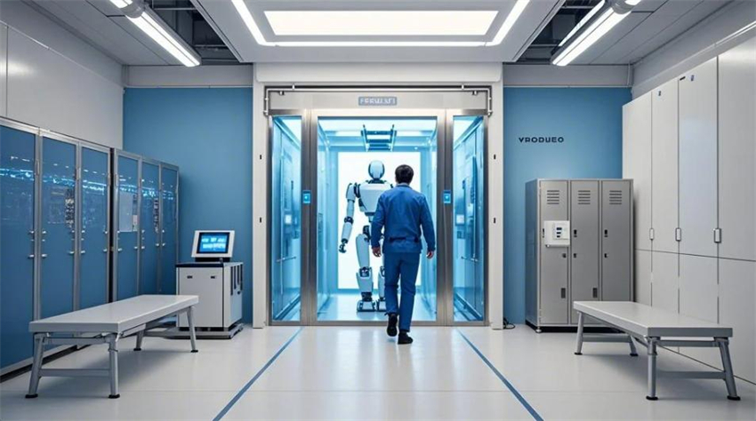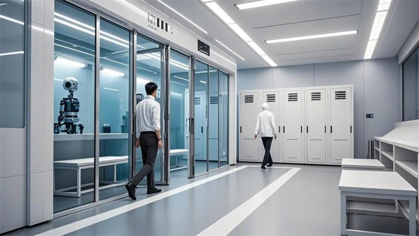 機械人研發實驗室,未來科技風格。實驗室分為研發區、測試區、裝配區和辦公區。研發區占50%,測試區占30%,裝配區占10%,辦公區占10%。研發區:防靜電環氧地坪(淺灰色),白色彩鋼板墻面和天花板,頂部高效過濾器(HEPA),不銹鋼工作臺,機械人原型和3D打印機排列整齊。測試區:機械人測試平臺,地面為防靜電PVC地板(淺色)。裝配區:工具架整齊,機械人部件分類存放。辦公區:玻璃隔斷,現代簡約辦公桌。整體色彩:白色、淺灰色、科技藍點綴。
