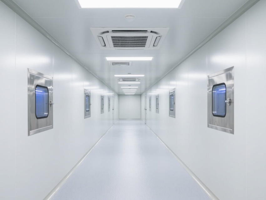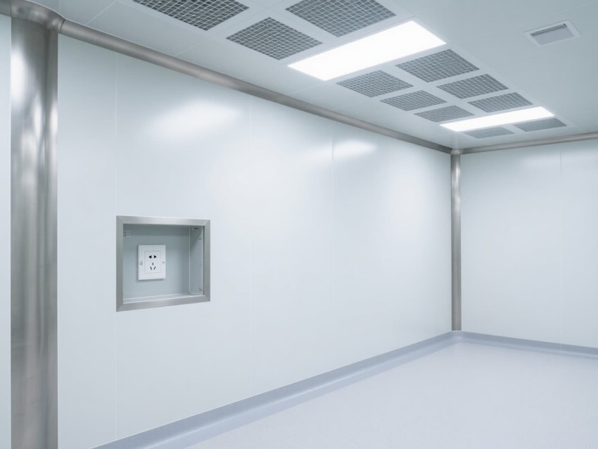 車間以白色抗菌彩鋼板為主體建材,搭配淺灰防靜電地坪,墻面與地面的圓弧過渡設(shè)計消除衛(wèi)生死角,便于徹底清潔消毒。頂部嵌入式高效送風(fēng)口形成垂直層流,配合側(cè)下回風(fēng)系統(tǒng),實現(xiàn)每小時15-25次的空氣置換,持續(xù)維持潔凈正壓。?